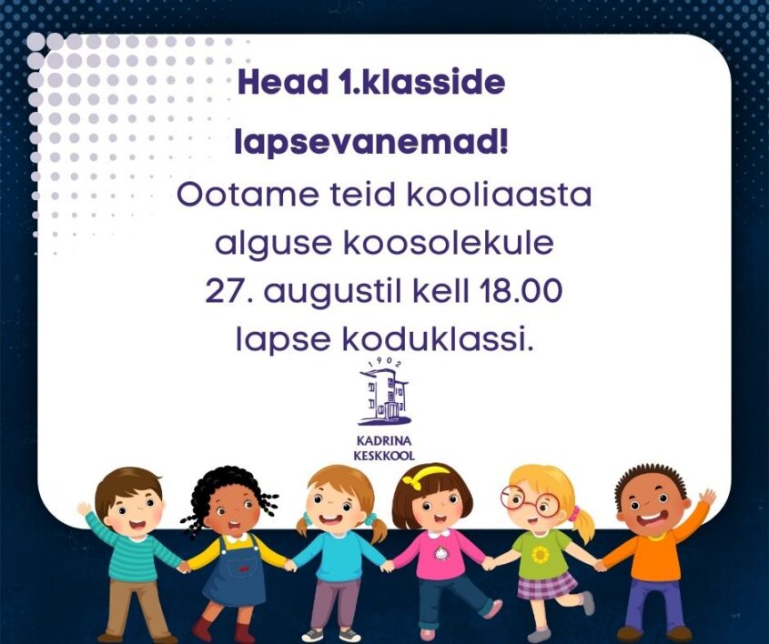 Kooliaasta alguse koosolek 1. klasside lapsevanematele Head 1. klasside lapsevanemad! Ootame teid kooliaasta alguse koosolekule 27. augustil kell 18:00 lapse koduklassi.