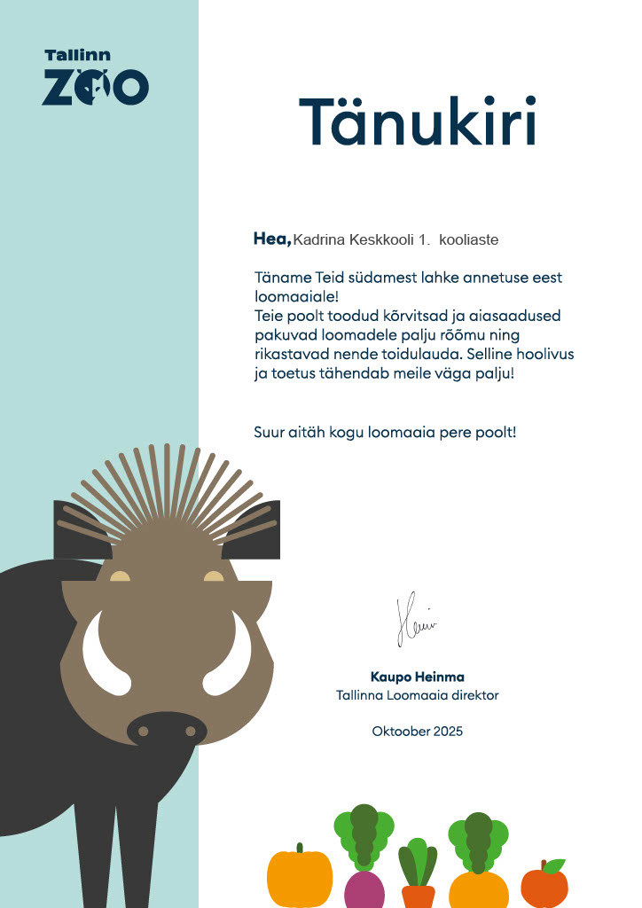 Tallinna Loomaaed on saatnud meile tänukirja ja tunnustuse. Jagame seda rõõmu nüüd ka teiega, sest see saavutus kuulub kogu meie kooliperele.