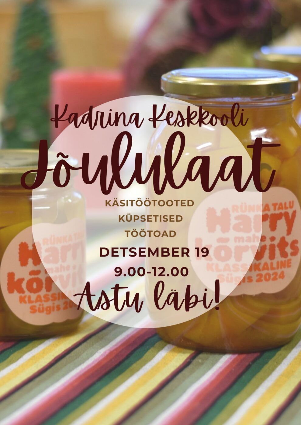 Kõik on oodatud Kadrina Keskkooli jõululaadale! Sel aastal kogume osa laadalt saadud tulust heategevuseks, et luua õpilastele veelgi põnevamaid ja arendavamaid vahetunni pesasid koolis! Laat algab A-korpuse sissepääsu juurest, tule ja osale!