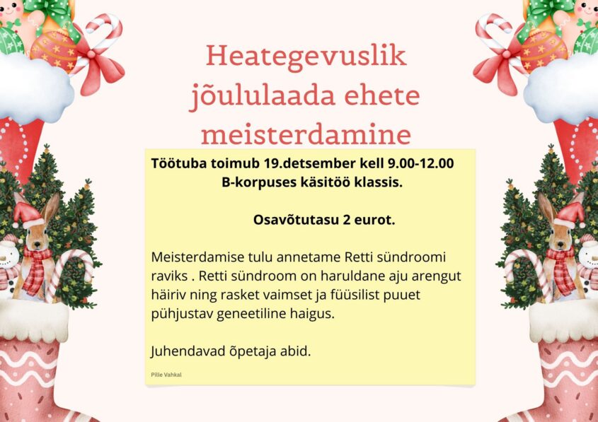 19. detsembril algusega kell 9.00 ootavad abiõpetajad teid vahvasse meisterdustöötuppa. Ühiselt meisterdades kogutud tulu annetame Retti sündroomi raviks.