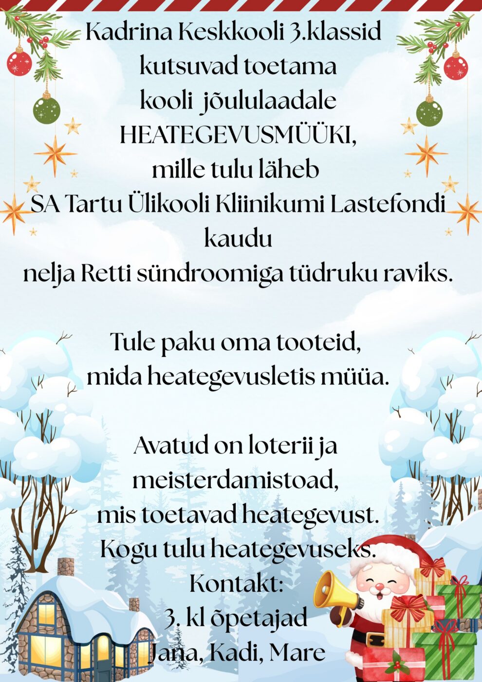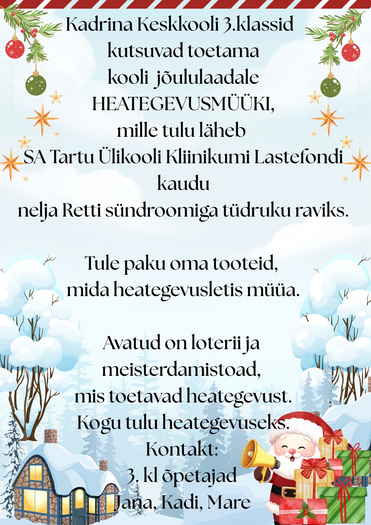 3. klassid soovivad jõululaadal, 19. detsembril korraldada heategevusmüüki ja loteriid, mille tulu läheb SA Tartu Ülikooli Kliinikumi Lastefondi kaudu Retti sündroomiga tüdrukute ravi toetuseks.
