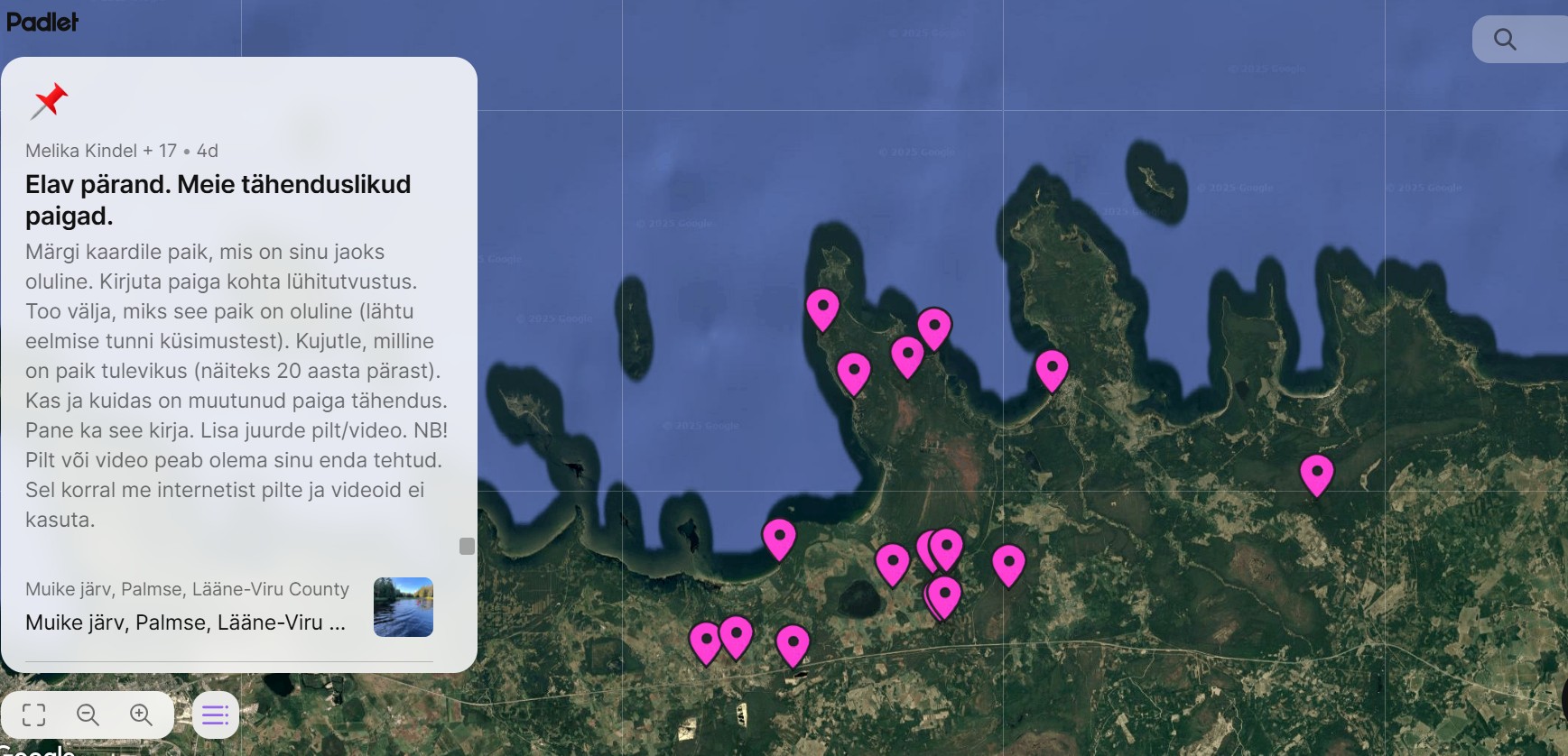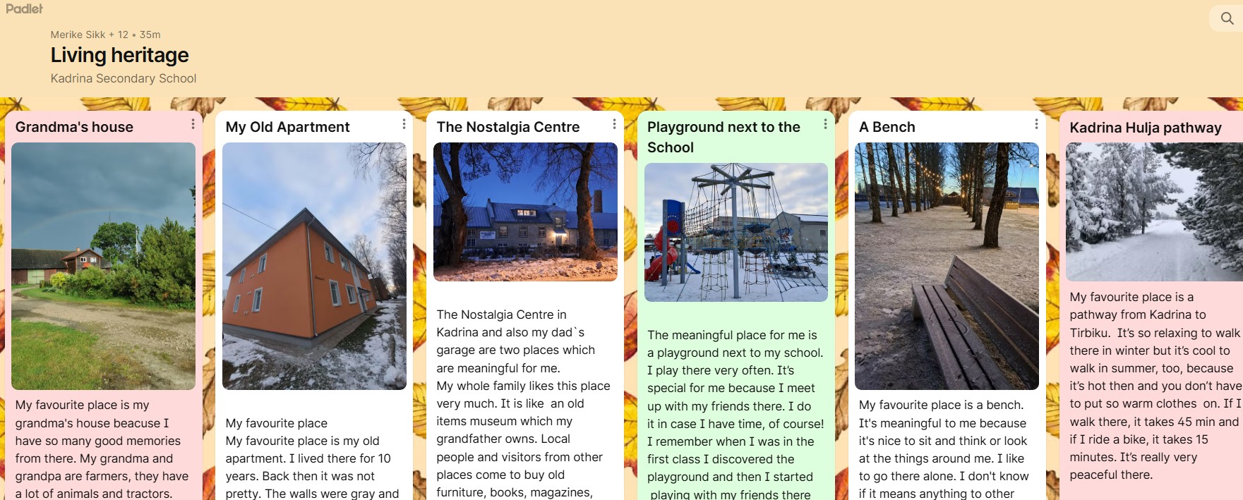Õpilastele olid antud arutelu suunamiseks küsimused, näiteks: millised paigad sulle meeldivad? Mis koht on sulle igapäevaelus eriline või oluline? Miks on see paik tähtis kogukonnale tervikuna ja/või sulle isiklikult? Kas see paik on ajas muutunud? Kui esimesena tahtsid pea kõik õpilased rääkida oma kodust, toast või voodist, jõuti koos arutledes kaugemale. Nii nimetati oma meeliskohtadena näiteks vanaema maja, pinki mänguväljakul või pargis, sõbra rõdu, aga ka Tartu raekoja platsi, Nostalgiakeskust ja loomulikult ka Kadrina Keskkooli. Õpilased pidid postitama oma erilise paiga foto ja kirjutama selle kohta lühikese jutukese. Kogusime kõik artiklid padletisse ja sealt tegime valiku nendest, mis projekti lehele meie kooli esindama üles laadisime.
