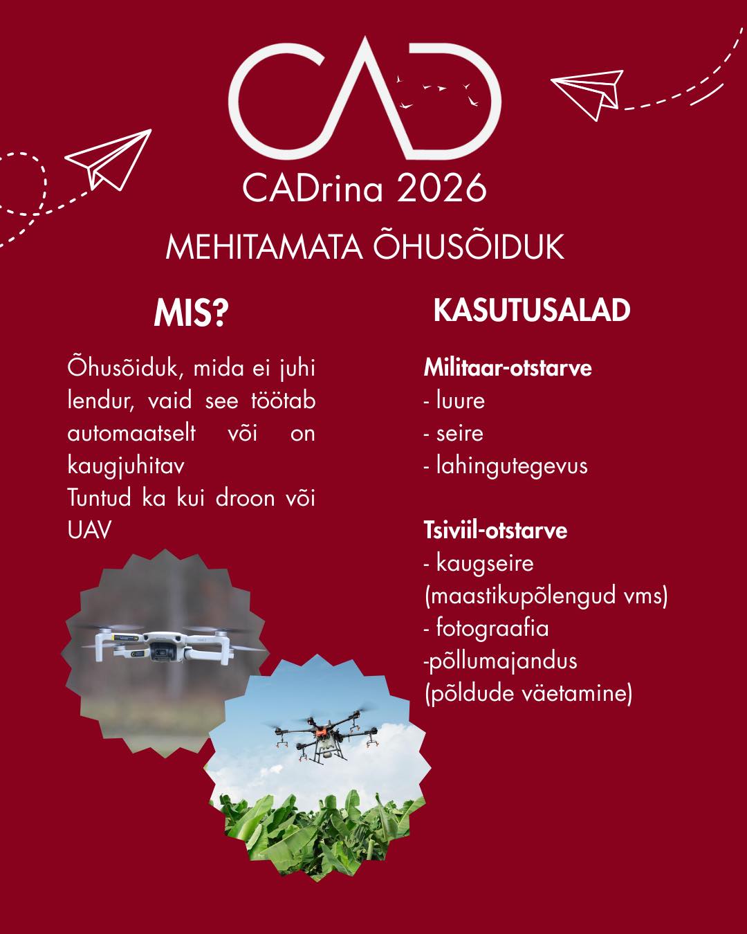 Kas teadsid, mis asi on mehitamata õhusõiduk? Tänavuse IT- ja nutifestival CADrina fookuses on just need põnevad lendavad abilised. 11. klassi HUSO suuna meediaõppurid Karoline Kalja ja Mary-Liis Luik seletavad lahti, millega täpselt tegu on.