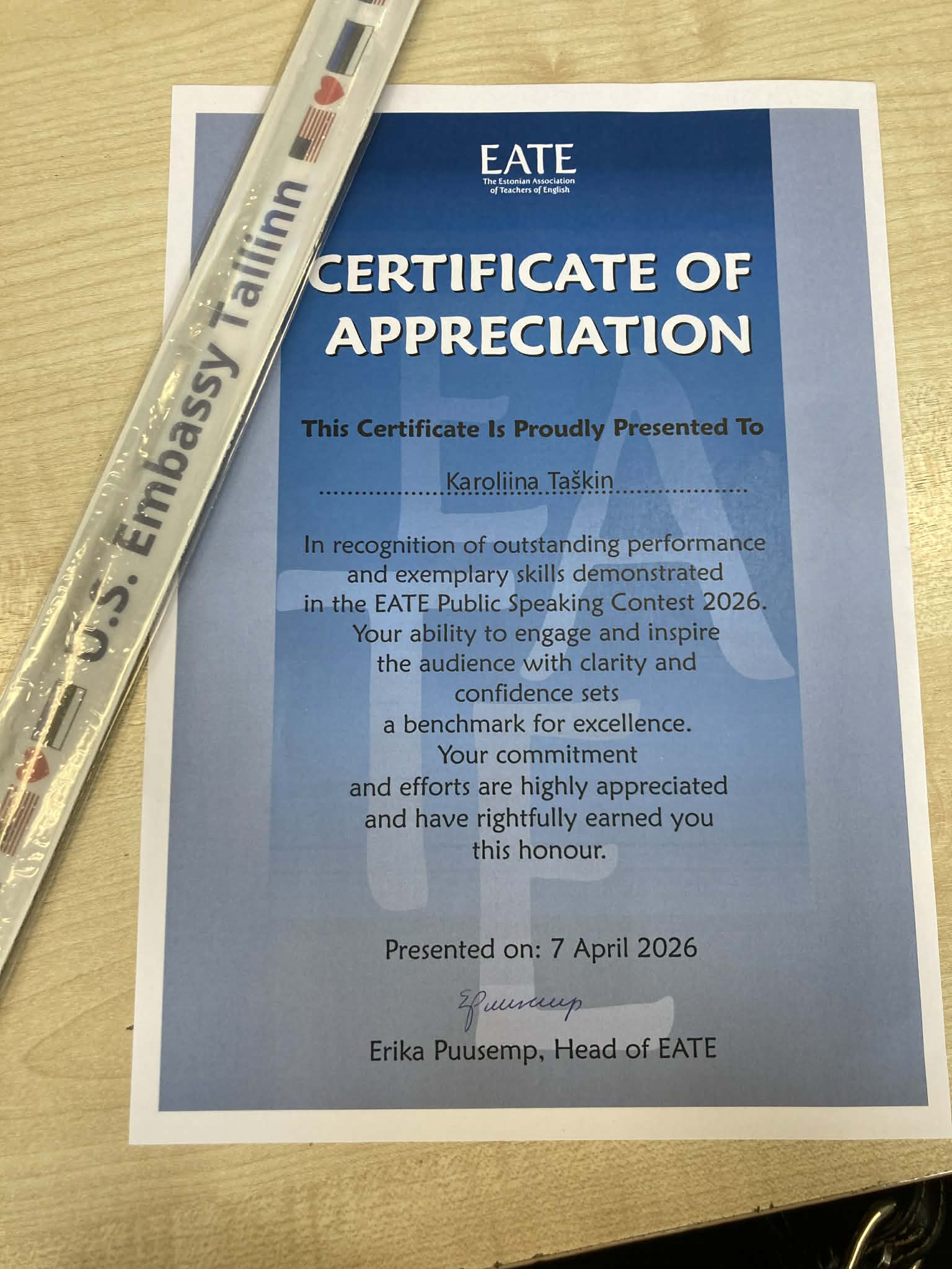 Karoliina Taškin 8.a klassist osales 7. aprillil Eesti Inglise Keele Õpetajate Seltsi poolt korraldatud üle-eestilisel inglise keele kõnevõistlusel. Põhikooliõpilastele toimus see esmakordselt. Kokku osales 57 julget noort!