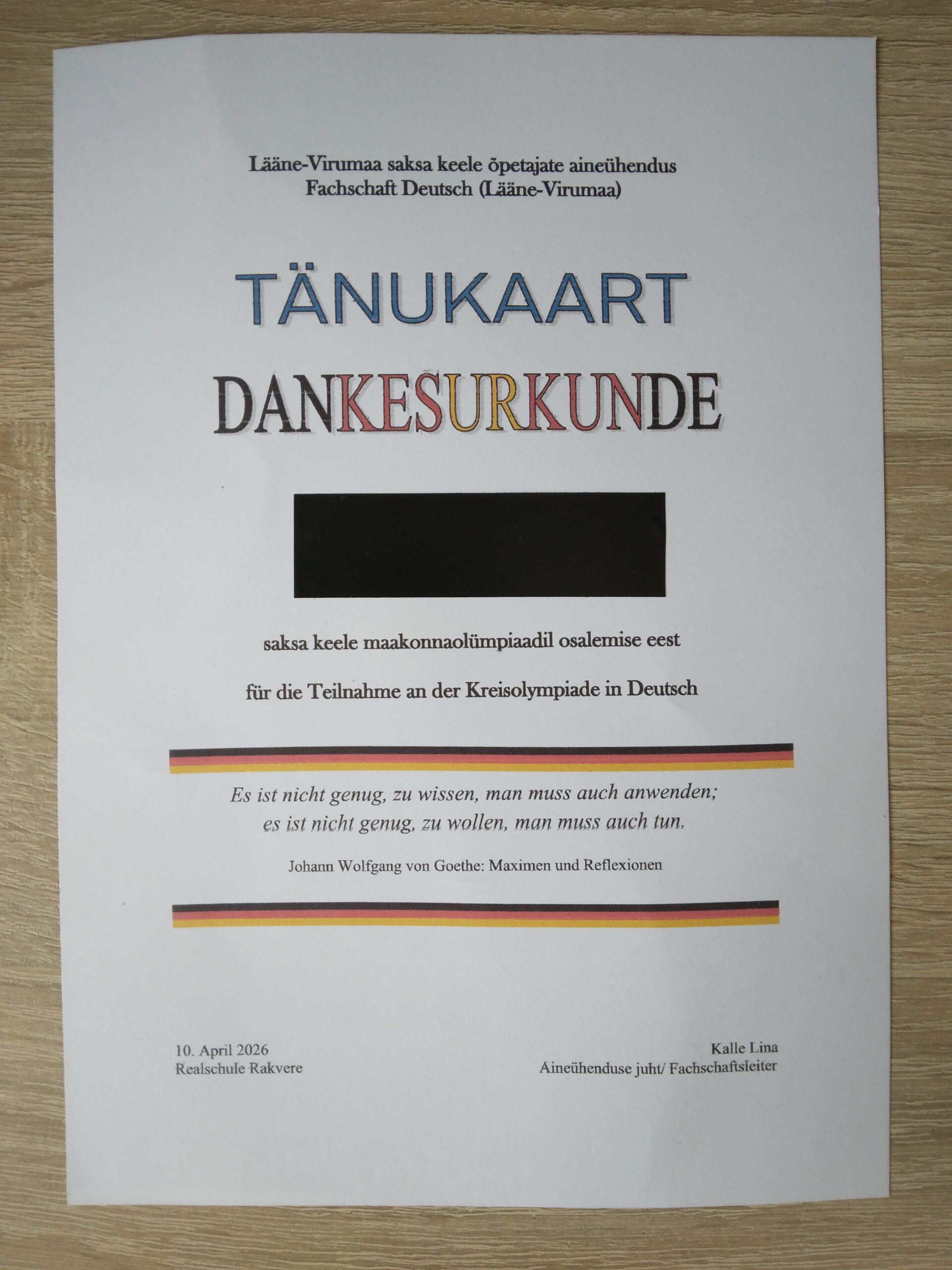 Suur tänu korraldusliku poole eest Lääne-Virumaa saksa keele õpetajate ainesektsiooni esimehele Kalle Linale ning Rakvere Reaalkooli saksa keele õpetajale Piret Steinbergile.
